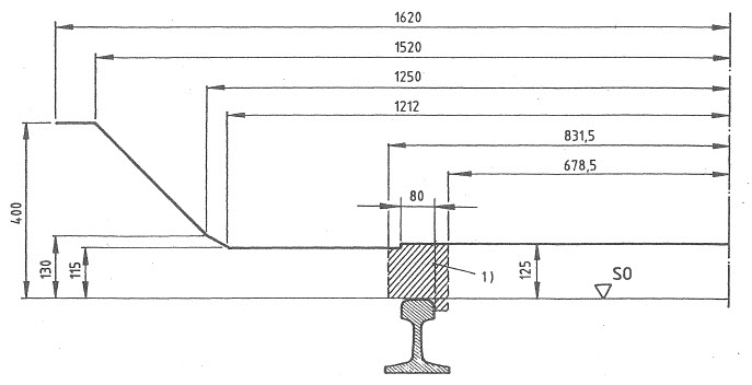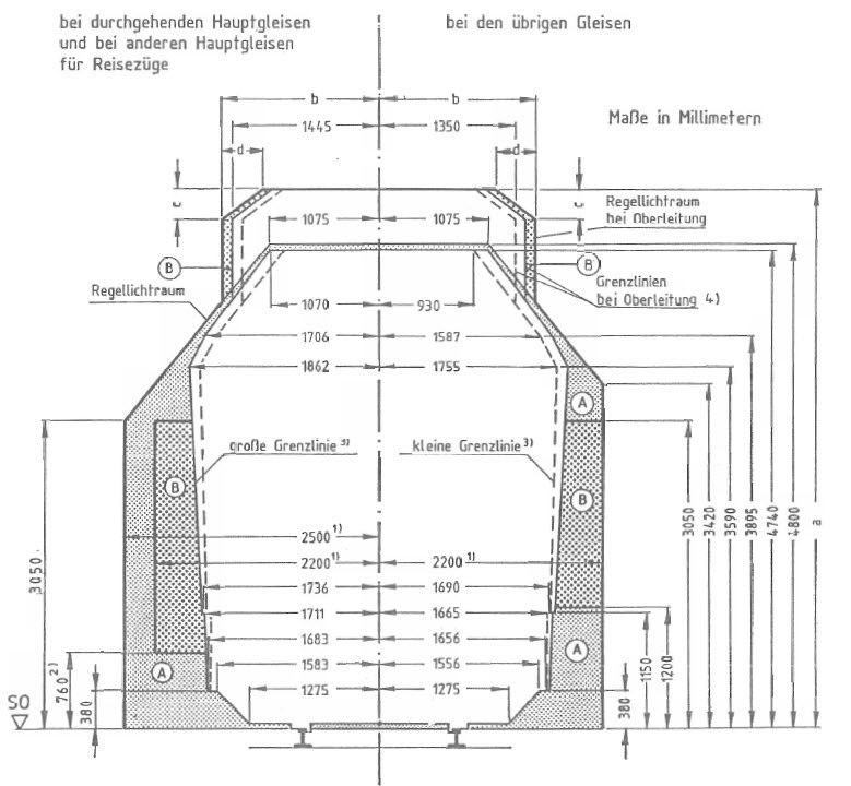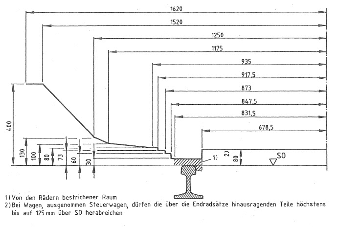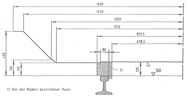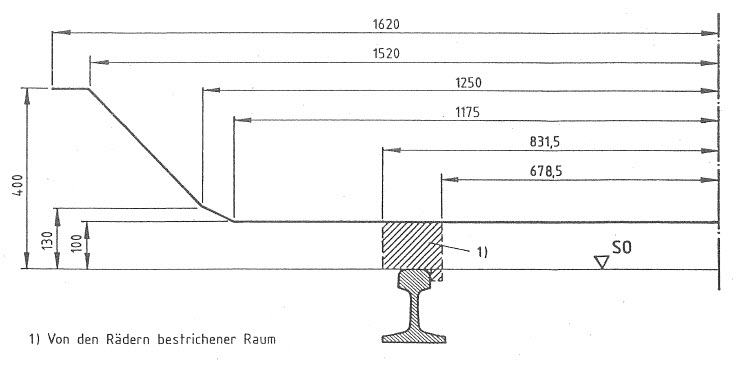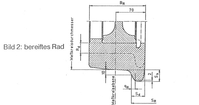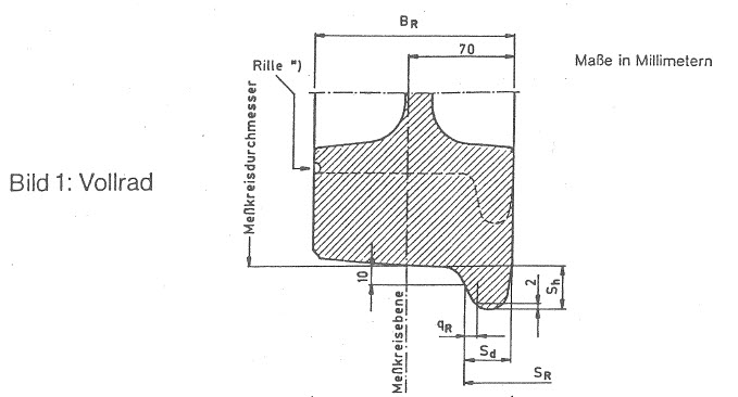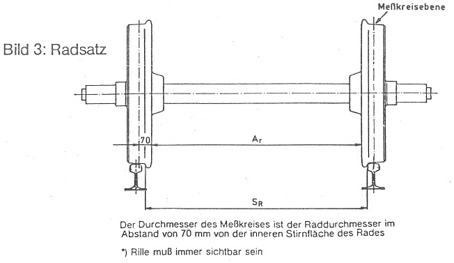 1) Bei Zwischenradsätzen beträgt das Mindestmaß 1395 mm2) Nennmaß 1360 mm3) 133 mm, wenn Balkengleisbremsen wirksam werden sollen4) Fahrzeuge im grenzüberschreitenden Verkehr5) Reisezugwagen im grenzüberschreitenden Verkehr6) Maß zur Beurteilung der Spurkranzflankenabnutzung