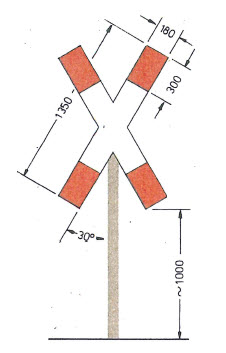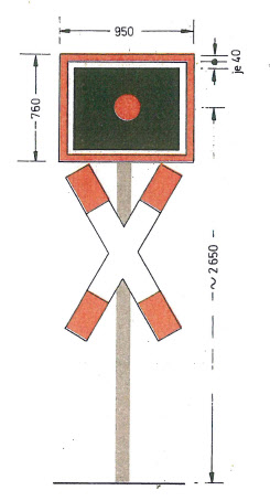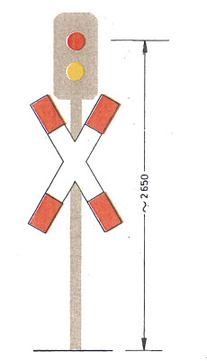 In Ortschaften oder bei beengten Verhältnissen darf das Andreaskreuz um 90° gedreht (quer) über dem Blinklicht angebracht und vom Höhenmaß “~ 2650” abgewichen werden.