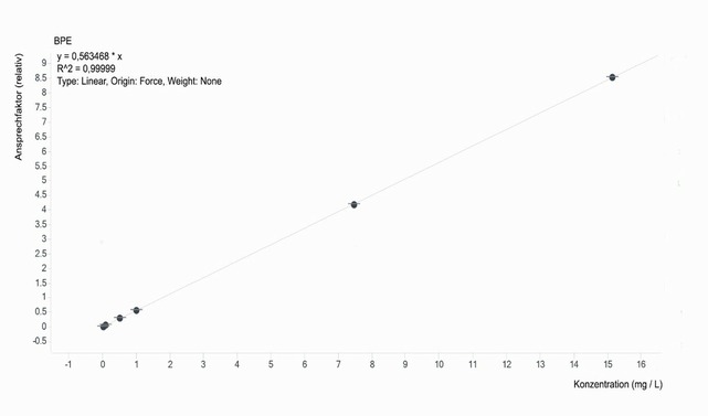 Die Kalibrierkurve wird konstruiert, indem das Verhältnis der Fläche des quantifizierenden Ions (m/z = 94) des BPE-Peaks zur Fläche des quantifizierenden Ions des d5-BPE-Peaks (m/z = 99) in jedem Standardchromatogramm gegen die genaue Konzentration des jeweiligen Standards in mg/l aufgetragen wird. Es wird eine lineare Regression mit erzwungenem Nulldurchgang angewandt. Mit Hilfe der Regressionsgerade wird die Konzentration der Probe in mg/l bestimmt.