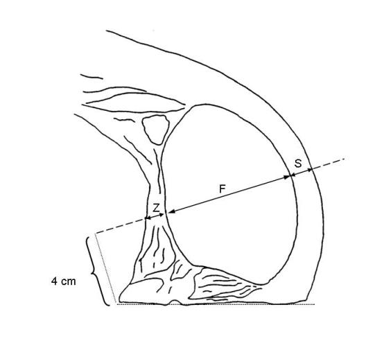 Gesamtmaß entspricht der Summe der Dicke des Rückenmuskels F und der Dicke des Zwischenrippengewebes Z (siehe Abbildung) und wird gleichzeitig und an der gleichen Stelle wie S in mm gemessen.