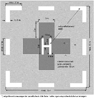 I.Start- und LandeflächeDie Mindestgröße der Start- und Landefläche beträgt 15 Meter mal 15 Meter; der Durchmesser einer kreisrunden Start- und Landefläche beträgt 15 Meter. Die Start- und Landefläche ist eben und frei von Objekten; ihre Neigung darf 5 Prozent nicht überschreiten. Die Tragfähigkeit der Start- und Landefläche muss der maximalen Startmasse des vom Luftfahrtunternehmen an der Landestelle konkret eingesetzten Hubschraubers entsprechen.