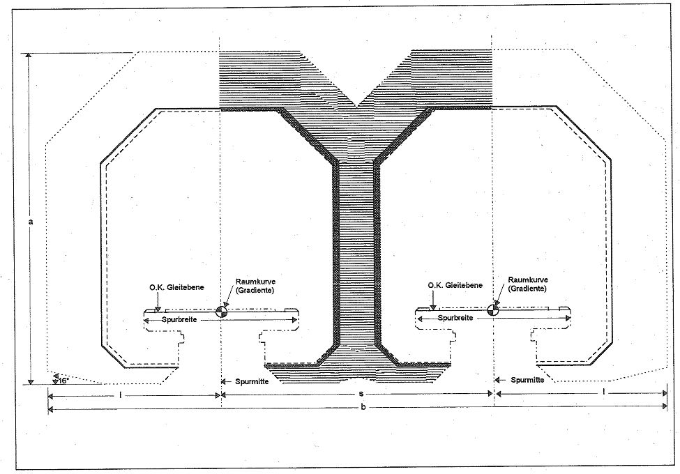 Bereiche B (Raumbedarf für Toleranzen des Fahrwegs und dessen Linienführung) und C (Kinematischer Raumbedarf des Fahrzeugs): Zulässig sind Einragungen nur während des Fahrgastwechsels sowie während des Reinigens und der Instandhaltung von Fahrzeugen.