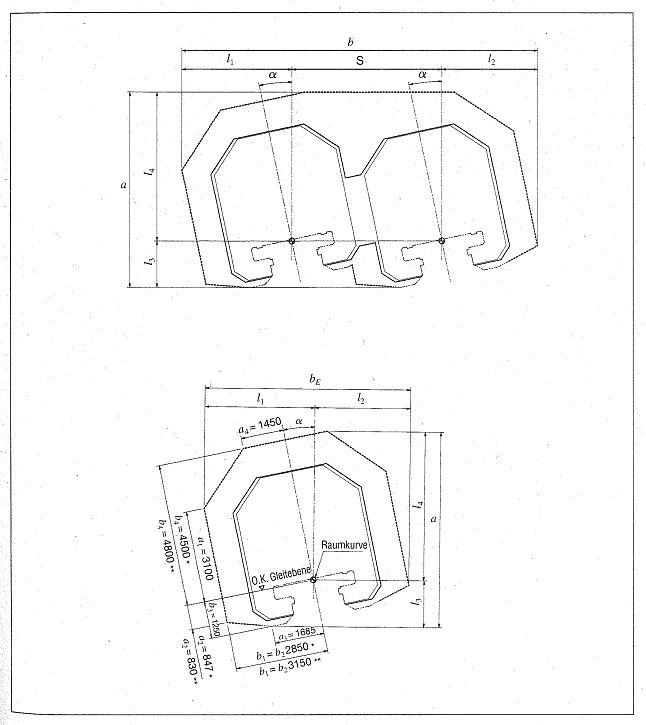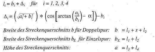 Berechnung der Breite des Streckenquerschnitts für Doppelspur b und Einzelspur bE sowie der Höhe des Streckenquerschnitts a in Abhängigkeit von der Querneigung α: