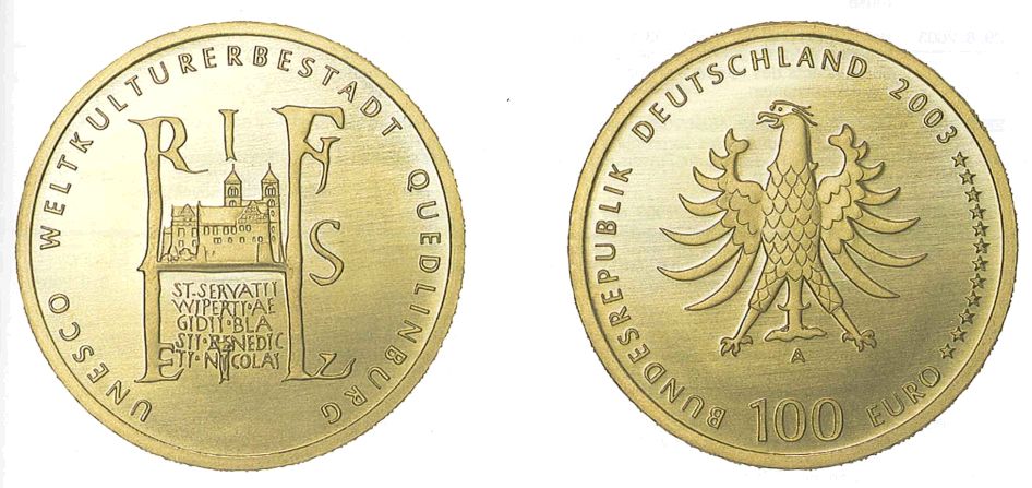 Gemäß den §§ 2, 4 und 5 des Münzgesetzes vom 16. Dezember 1999 (BGBl. I S. 2402) hat die Bundesregierung beschlossen, zum Thema "UNESCO Weltkulturerbestadt Quedlinburg" eine Gedenkmünze zu 100 Euro aus Gold prägen zu lassen.