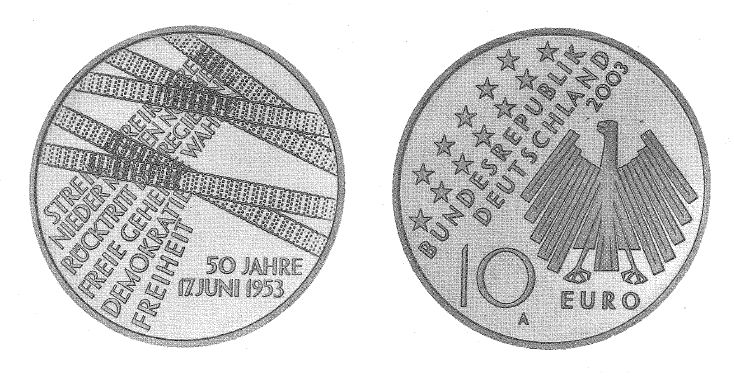 Gemäß den §§ 2, 4 und 5 des Münzgesetzes vom 16. Dezember 1999 (BGBl. I S. 2402) hat die Bundesregierung beschlossen, zum Thema "50 Jahre Volksaufstand 17. Juni 1953" eine deutsche Euro-Gedenkmünze im Nennwert von 10 Euro prägen zu lassen.