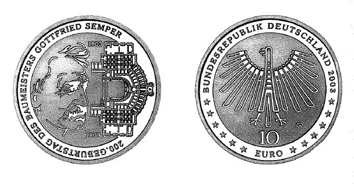 Gemäß den §§ 2, 4 und 5 des Münzgesetzes vom 16. Dezember 1999 (BGBl. I S. 2402) hat die Bundesregierung beschlossen, zum 200. Geburtstag des Baumeisters Gottfried Semper eine deutsche Euro-Gedenkmünze im Nennwert von 10 Euro prägen zu lassen.