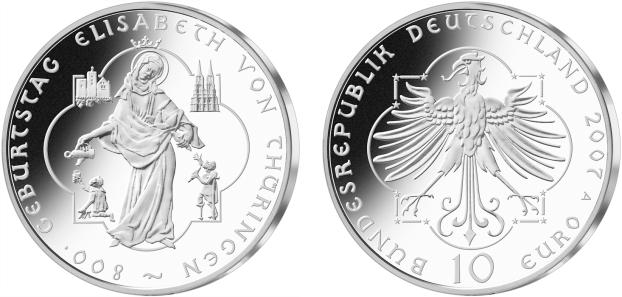 Gemäß den §§ 2, 4 und 5 des Münzgesetzes vom 16. Dezember 1999 (BGBl. I S. 2402) hat die Bundesregierung beschlossen, aus Anlass des 800. Geburtstages der Elisabeth von Thüringen eine deutsche Euro-Gedenkmünze im Nennwert von 10 Euro prägen zu lassen. Die Auflage beträgt maximal 1.900.000 Stück, darunter maximal 300.000 Stück in Spiegelglanzausführung. Die Prägung erfolgt durch die Staatliche Münze Berlin. Die Münze wird ab dem 8. November 2007 in den Verkehr gebracht. Sie besteht aus einer Legierung von 925 Tausendteilen Silber und 75 Tausendteilen Kupfer, hat einen Durchmesser von 32,5 Millimetern und eine Masse von 18 Gramm. Das Gepräge auf beiden Seiten ist erhaben und wird von einem schützenden, glatten Randstab umgeben. Die Bildseite zeigt durch vier Motive das Wirken der Heiligen Elisabeth von Thüringen: Speisung der Armen im unteren und ihre Lebensmittelpunkte im oberen Teil. Diese Motive befinden sich in den Winkeln eines Vierpasses, während die Heilige in den Mittelpunkt gerückt ist. Die Figur Elisabeths bringt ihre Aufopferung für die Bedürftigen und Kranken zum Ausdruck. Die Wertseite zeigt einen sehr gut ausgearbeiteten, gotisch anmutenden Adler. Die gewählte Unzialschrift und der Vierpass, der die 12 Sterne enthält, verbinden Bild- und Wertseite in hervorragender Weise. Zudem zeigt die Wertseite den Schriftzug „BUNDESREPUBLIK DEUTSCHLAND“, die Wertziffer und Wertbezeichnung, die Jahreszahl 2007 sowie das Prägezeichen „A“ der Staatlichen Münze Berlin. Der glatte Münzrand enthält in vertiefter Prägung die Inschrift: „WIR SOLLEN DIE MENSCHEN FROH MACHEN *“. Der Entwurf der Münze stammt von Frau Barbara G. Ruppel, Krailling.