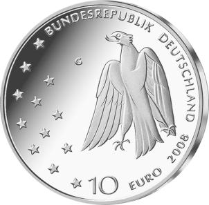 Die Wertseite zeigt einen Adler, den Schriftzug „BUNDESREPUBLIK DEUTSCHLAND“, die zwölf Europa-Sterne, die Wertziffer mit der Euro-Bezeichnung sowie die Jahreszahl 2008 und das Münzzeichen „G“ der Staatlichen Münzen Baden-Württemberg, Prägestätte Karlsruhe.