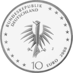 Die Wertseite zeigt einen Adler, den Schriftzug „BUNDESREPUBLIK DEUTSCHLAND“, die zwölf Europa-Sterne, die Wertziffer mit der Euro-Bezeichnung sowie die Jahreszahl 2008 und das Münzzeichen „J“ der Hamburgischen Münze.