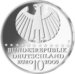 Die Wertseite zeigt einen Adler, den Schriftzug „BUNDESREPUBLIK DEUTSCHLAND“, die zwölf Europa-Sterne, die Wertziffer mit der Euro-Bezeichnung sowie die Jahreszahl 2009 und das Münzzeichen „F“ der Staatlichen Münzen Baden-Württemberg, Prägestätte Stuttgart.