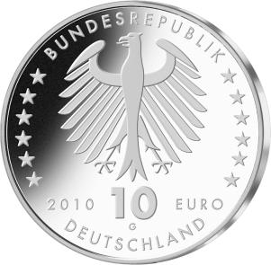 Die Wertseite zeigt einen Adler, den Schriftzug „BUNDESREPUBLIK DEUTSCHLAND“, die zwölf Europasterne, die Wertziffer und Wertbezeichnung sowie die Jahreszahl 2010 und das Prägezeichen „G“ der Staatlichen Münzen Baden-Württemberg, Prägestätte Karlsruhe.