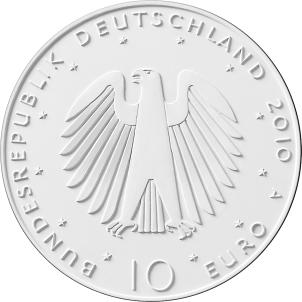 Die Wertseite zeigt einen Adler, den Schriftzug „BUNDESREPUBLIK DEUTSCHLAND“, die Wertziffer und Wertbezeichnung, die Jahreszahl 2010 sowie das Prägezeichen „A“ der Staatlichen Münze Berlin.