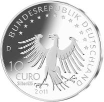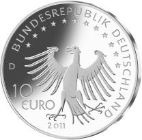 Die Wertseite zeigt eine mit der Bildseite harmonierende Adlerdarstellung, den Schriftzug „BUNDESREPUBLIK DEUTSCHLAND“, Wertziffer und Wertbezeichnung, das Prägezeichen „D“, die Jahreszahl 2011 sowie die zwölf Europasterne. Die Wertseite der Münze in Spiegelglanzqualität trägt ferner den Prägeaufdruck „Silber 625“.