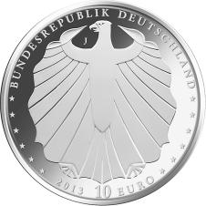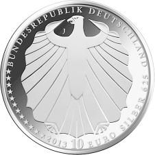 Die Wertseite zeigt einen Adler, den Schriftzug „BUNDESREPUBLIK DEUTSCHLAND“, Wertziffer und Wertbezeichnung, das Prägezeichen „J“ der Hamburgischen Münze, die Jahreszahl 2013 sowie die zwölf Europasterne. Auf der Wertseite der Münze in Spiegelglanzqualität ist zusätzlich die Angabe „SILBER 625“ aufgeprägt.