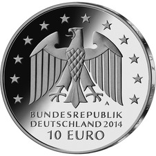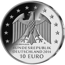 Die Wertseite zeigt einen Adler, den Schriftzug „BUNDESREPUBLIK DEUTSCHLAND“, Wertziffer und Wertbezeichnung, das Prägezeichen „A“ der Staatlichen Münze Berlin, die Jahreszahl 2014 sowie die zwölf Europasterne. Auf der Wertseite der Münze in Spiegelglanzqualität ist zusätzlich die Angabe „SILBER 625“ aufgeprägt.