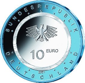 Die Auflage der Münze beträgt 1 750 000 Stück, davon 250 000 Stück in Spiegelglanzqualität. Die Münze wird zu gleichen Teilen in den Münzstätten Berlin, München, Stuttgart, Karlsruhe und Hamburg geprägt. Sie besteht aus drei Komponenten: Einem äußeren blauen, Niob beschichteten Kupfer-Nickel-Ring, einem inneren Kern (Pille) aus Metall (CuNi19) sowie einem prägbaren, zwischen Ring und Pille eingefügten, Polymerring. Die Münze hat einen Durchmesser von 28,75 Millimetern und eine Masse von 9,8 Gramm. Das Gepräge auf beiden Seiten ist erhaben und wird von einem schützenden, glatten Randstab umgeben.
