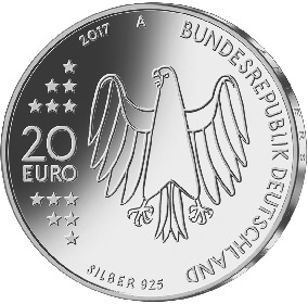 Die Wertseite zeigt einen Adler, den Schriftzug „BUNDESREPUBLIK DEUTSCHLAND“, Wertziffer und Wertbezeichnung, das Prägezeichen „A“ der Staatlichen Münze Berlin, die Jahreszahl 2017 sowie die zwölf Europasterne. Zusätzlich ist die Angabe „SILBER 925“ aufgeprägt.