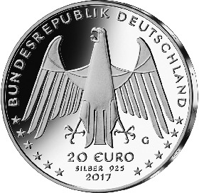 Die Wertseite zeigt einen Adler, den Schriftzug „BUNDESREPUBLIK DEUTSCHLAND“, Wertziffer und Wertbezeichnung, das Prägezeichen „G“ der Staatlichen Münzen Baden-Württemberg, Prägestätte Karlsruhe, die Jahreszahl 2017 sowie die zwölf Europasterne. Zusätzlich ist die Angabe „SILBER 925“ aufgeprägt.