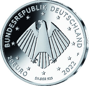 Die Wertseite zeigt einen Adler, den Schriftzug „BUNDESREPUBLIK DEUTSCHLAND“, Wertziffer und Wertbezeichnung, die Jahreszahl „2022“, die zwölf Europasterne sowie das Prägezeichen „F“. Zusätzlich ist die Angabe „SILBER 925“ aufgeprägt.