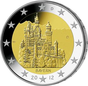 Die nationale Seite zeigt die weltweit bekannteste Ansicht von Schloss Neuschwanstein. Die Länderbezeichnung „BAYERN“ verknüpft das abgebildete Bauwerk mit dem Bundesland. Auf der Randzone sind die zwölf Europasterne, das Ausgabejahr 2012 und die Kennzeichnung „D“ für das Ausgabeland Bundesrepublik Deutschland zu sehen.