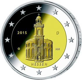 Die nationale Seite zeigt die Paulskirche. Die Länderbezeichnung „HESSEN“ verknüpft das abgebildete Bauwerk mit dem Bundesland.