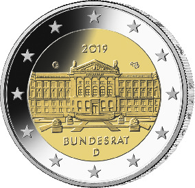 Die nationale Seite zeigt eine perspektivische Darstellung des Garten- und Gebäudeensembles des Bundesrates. Auf dem inneren Kern befinden sich ferner der Schriftzug „BUNDESRAT“, das Ausgabejahr 2019, die Kennzeichnung „D“ für das Ausgabeland Bundesrepublik Deutschland, das Münzzeichen der jeweiligen Prägestätte („A“, „D“, „F“, „G“ oder „J“) sowie die Initialen des Künstlers. Der äußere Ring der nationalen Seite zeigt die zwölf Europasterne.