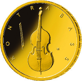 Die Bildseite zeigt den Kontrabass als wichtiges Orchesterinstrument, das repräsentativ in das Münzrund gesetzt ist.