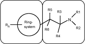 Zudem gehören Stoffe dazu, bei denen das Stickstoffatom Bestandteil eines cyclischen Systems ist (beispielsweise Pyrrolyl-, Pyrrolidinyl-, Piperidinyl-, Morpholino-Reste). Diese Ringsysteme dürfen im Ring die Elemente Kohlenstoff, Sauerstoff, Schwefel und Stickstoff aufweisen und eine Ringgröße bis zu sieben Atomen aufweisen. Die Ringsysteme können an jeder Position mit folgenden Atomen oder Atomgruppen substituiert sein: Wasserstoff, Fluor, Chlor, Brom, Iod, Hydroxy-, Alkyl- (bis C6) und Phenylgruppen.