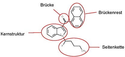 Die Abbildung verdeutlicht den modularen Aufbau am Beispiel des 1-Fluor-JWH-018: