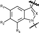 Indol-1,3-diyl (X = CH, C-CH3, C-F, C-Cl, C-Br und C-I) und Indazol-1,3-diyl (X = N) (Bindungsort für die Brücke in Position 3, Bindungsort für die Seitenkette in Position 1)