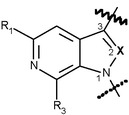 4-, 5-, 6- oder 7-Azaindol-1,3-diyl (X = CH, C-CH3, C-F, C-Cl, C-Br und C-I) und 4-, 5-, 6- oder 7-Azaindazol-1,3-diyl (X = N) (Bindungsort für die Brücke in Position 3, Bindungsort für die Seitenkette in Position 1)