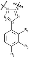 Pyrazol-1,5-diyl (Bindungsort für die Brücke in Position 5, Bindungsort für die Seitenkette in Position 1)
