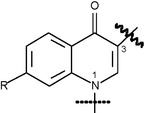 4-Chinolon-1,3-diyl (Bindungsort für die Brücke in Position 3, Bindungsort für die Seitenkette in Position 1)