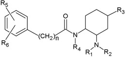 Die Grundstruktur N-(2-Aminocyclohexyl)amid kann an den in der Abbildung gekennzeichneten Positionen mit einer beliebigen Kombination der folgenden Atome, verzweigten oder nicht verzweigten Atomgruppen oder Ringsystemen (Reste R1 bis R6) substituiert sein: