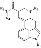 9,10-Ergolen abgeleitete Verbindung ist jede chemische Verbindung, die von der nachfolgend abgebildeten Grundstruktur abgeleitet werden kann, eine maximale Molekülmasse von 600 u hat und mit den nachfolgend beschriebenen Substituenten besetzt sein kann.