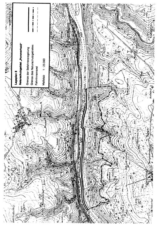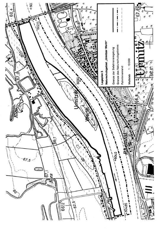 die Wasserfläche zwischen der Linie, die ab Rhein-km 602,15 in einem Abstand von 150 m vom rechten Rheinufer verläuft, entlang dem südlichen Ufer der Insel Urmitzer Werth einschließlich der ober- und unterhalb daran anschließenden Parallelwerke führt und weiter in einem Abstand von 100 m vom rechten Rheinufer bis Rhein-km 604,65 verläuft, und dem rechten Rheinufer von Rhein-km 602,15 bis Rhein-km 604,65 (Lageplan 5).