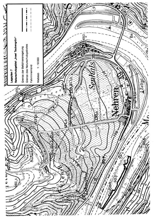 die Wasserfläche zwischen der Insel Taubengrün und dem rechten Moselufer von Mosel-km 69,99 bis Mosel-km 70,64 (Lageplan 7);