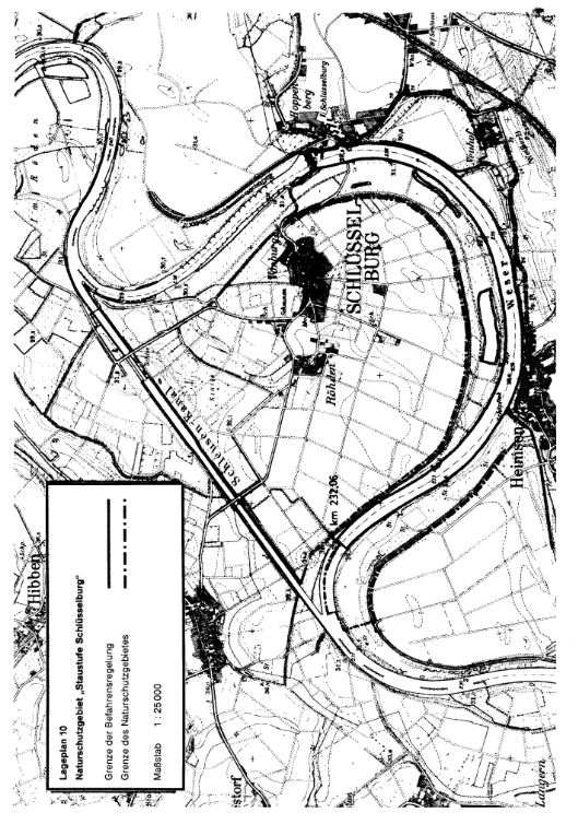 (5) Es ist untersagt, die Bundeswasserstraße Weser im Naturschutzgebiet „Staustufe Schlüsselburg“ zwischen Weser-km 232,06 und dem Wehr bei Weser-km 236,60 zu befahren (Lageplan 10). Satz 1 gilt nicht in der Zeit vom 16. April bis zum 30. September für Segelfahrzeuge mit Antriebsmaschine und sonstige Kleinfahrzeuge ohne Antriebsmaschine. In der Zeit vom 1. Oktober bis zum 15. April dürfen Kleinfahrzeuge ohne Antriebsmaschine nach Einstellung des Betriebes der Schleuse Schlüsselburg bis ½ Stunde nach Sonnenuntergang die in Satz 1 bezeichnete Wasserfläche zügig durchfahren. Wasserfahrzeuge, die die in Satz 1 genannte Wasserfläche befahren dürfen, müssen, außer im Bereich der Bootsumtragestelle und der genehmigten Steganlagen, einen Mindestabstand von 15 m zu den Ufern einhalten.