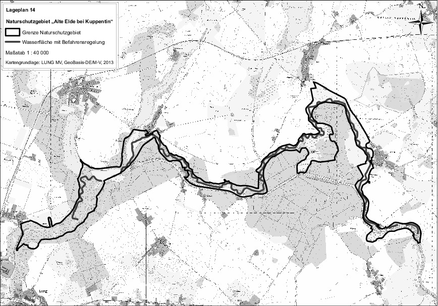die Wasserfläche der Alten Elde im Bereich des Naturschutzgebietes „Alte Elde bei Kuppentin“ zwischen der Mündung in die Müritz-Elde-Wasserstraße bei km 103,52 und dem Beginn bei Forsthof an der Müritz-Elde-Wasserstraße km 110,80 nach Maßgabe des Lageplans 14;