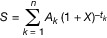 Mathematisch darstellen lässt sich diese Gleichung durch eine einzige Summation unter Verwendung des Faktors „Ströme“ (Ak), die entweder positiv oder negativ sind, je nachdem, ob sie für Auszahlungen oder für Rückzahlungen innerhalb der Perioden 1 bis n, ausgedrückt in Jahren, stehen: