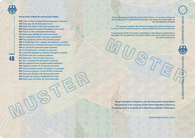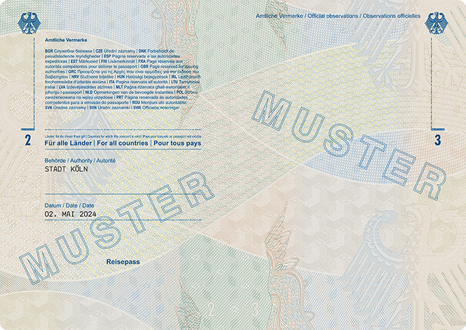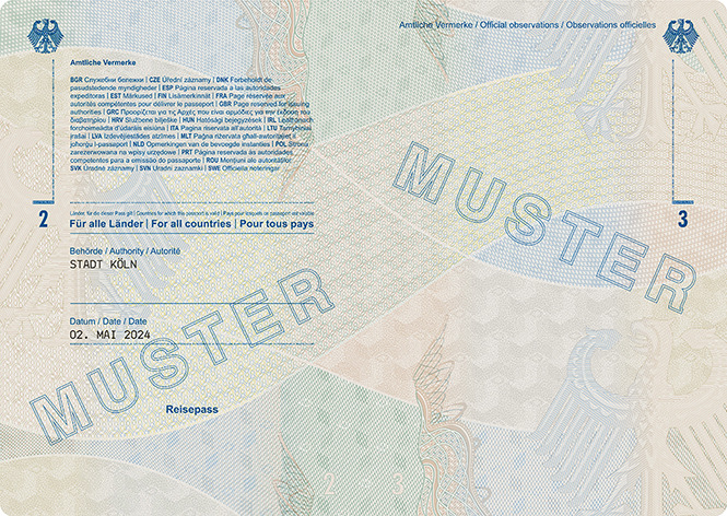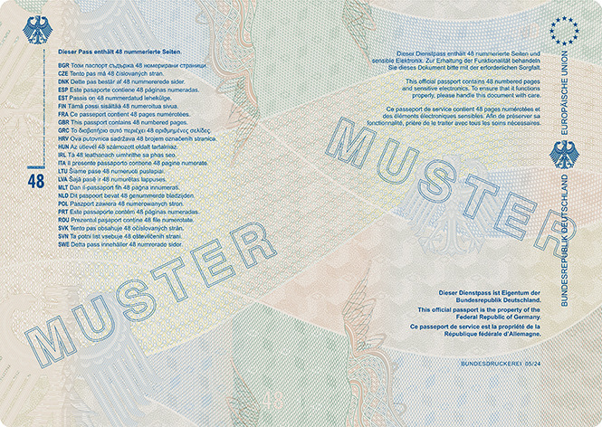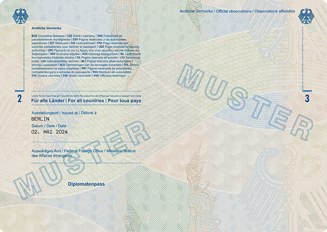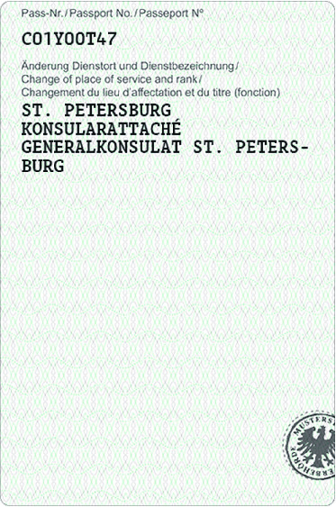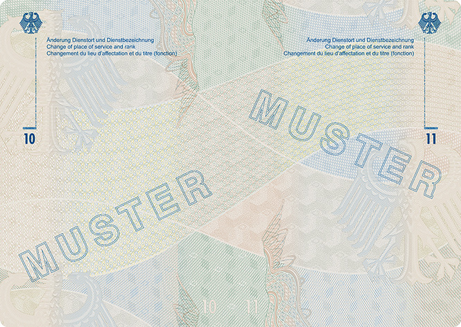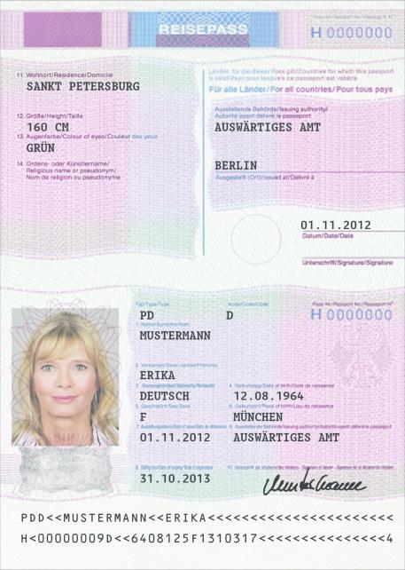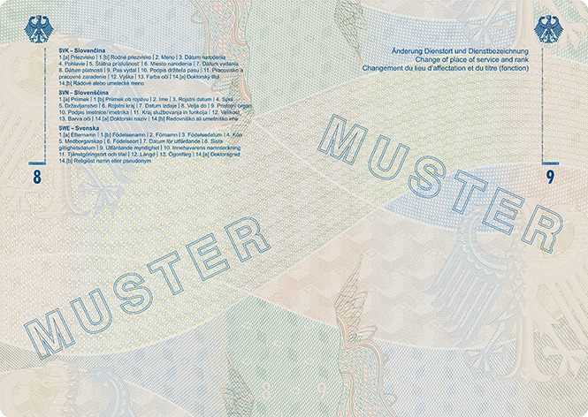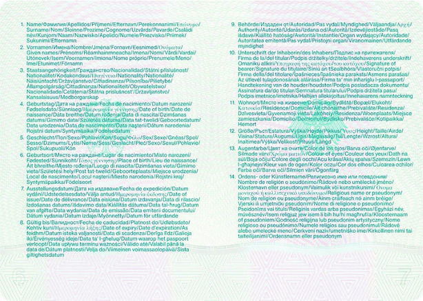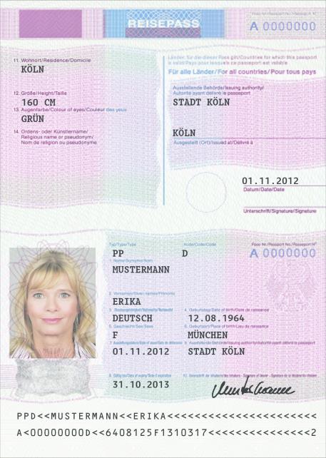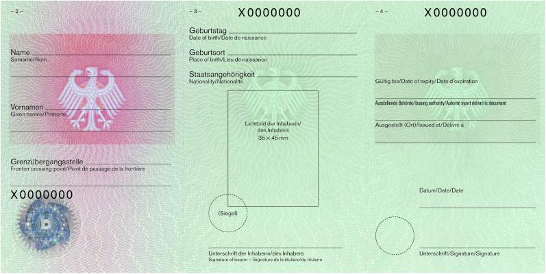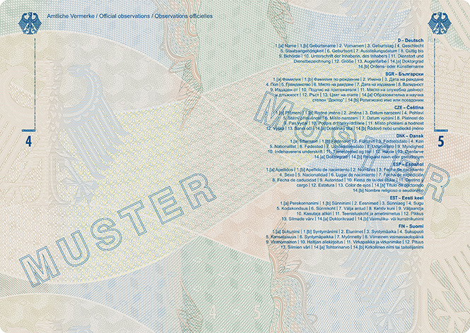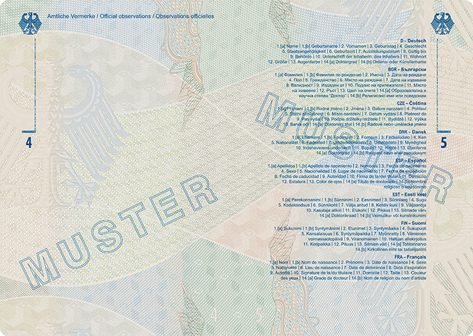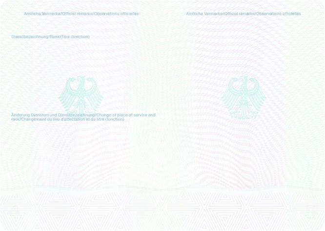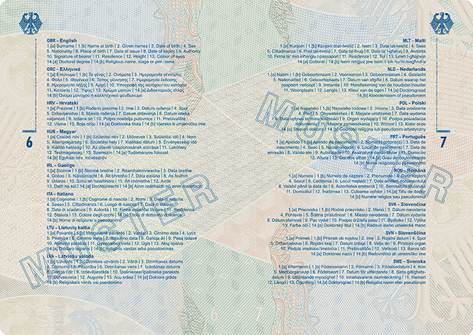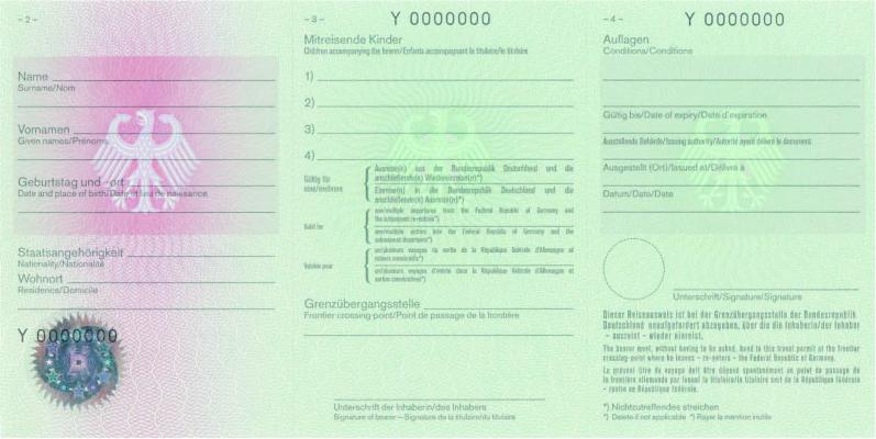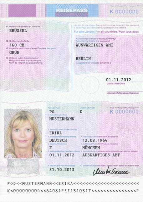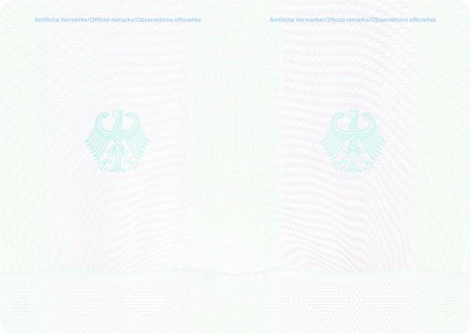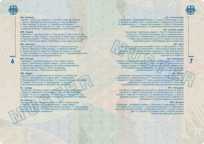 1 Fall: Es gibt keinen Geburtsnamen.2 Fall: Es gibt einen Geburtsnamen.3 Gilt nur für amtliche Pässe.4 Gilt nur für amtliche Pässe.5 Beim Diplomaten- und Dienstpass ist nur eine Zeile vorgesehen.6 Größenangabe im Format „123 CM“.