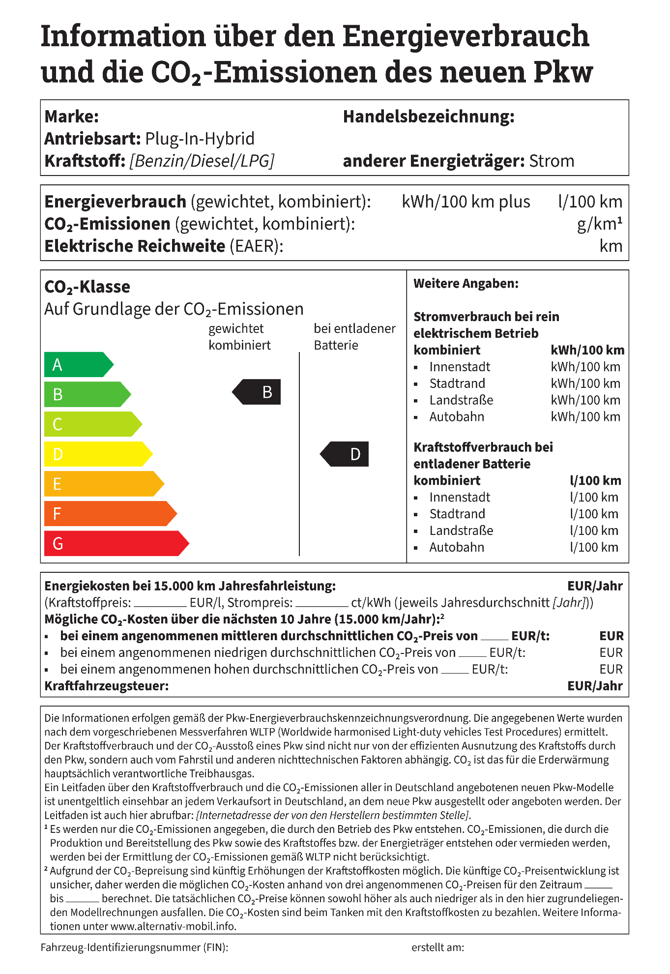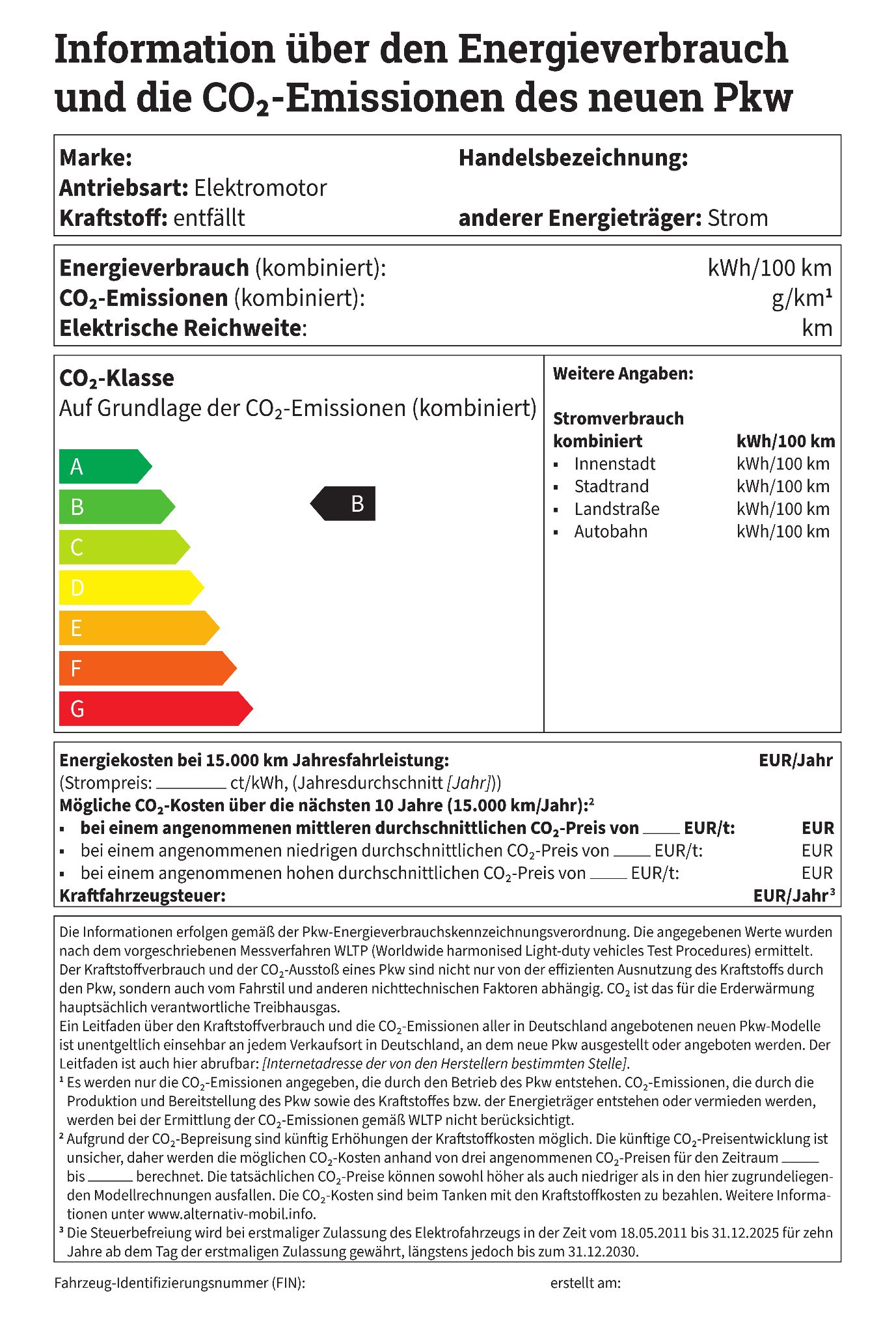 Für rein elektrisch betriebene Fahrzeuge und für extern aufladbare Hybridelektrofahrzeuge müssen zudem der Stromverbrauch und die elektrische Reichweite des neuen Personenkraftwagens angegeben werden.