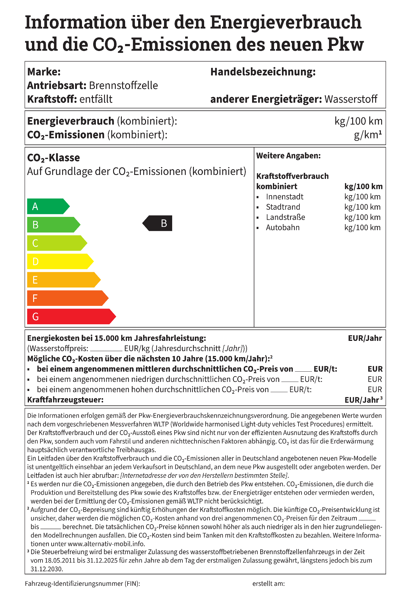 Einen Hinweis, dass sich der Energieverbrauch (Verbrauch von Kraftstoff, Wasserstoff und Strom) und die CO2-Emissionen durch eine regelmäßige Wartung des Fahrzeugs, dessen richtige Benutzung und eine entsprechende Fahrweise vermindern lassen, insbesondere durch einen defensiven Fahrstil, niedrige Reisegeschwindigkeiten, vorausschauendes Bremsverhalten, richtigen Reifendruck, keinen unnötigen Leerlauf des Motors und keinen überflüssigen Ballast;