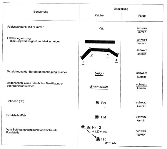 Bei Änderung von Bergbauberechtigungen ist die bisherige Bezeichnung in der Farbe karmin durchzustreichen. Die Feldesbegrenzung (Markscheide) ist durch schrägliegende Kreuze in der Farbe karmin ungültig zu machen.