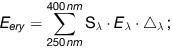 „Erythemwirksame Bestrahlungsstärke (Eery)“ ist die Summation des Produktes aus gemessener spektraler Bestrahlungsstärke (Eλ) in Watt pro Quadratmeter und Nanometer (Wm-2nm-1), dem jeweiligen wellenlängenabhängigen Wichtungsfaktor (Sλ) für das UV-Erythem nach Anlage 2 und dem jeweiligen Intervall der Wellenlänge Δλ in Nanometern (nm), wobei gilt Δλ < 2,5 Nanometer (nm), über den Wellenlängenbereich von 250 bis 400 Nanometern (nm):