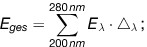 „Gesamte Bestrahlungsstärke (Eges)“ ist die Summation des Produktes aus gemessener spektraler Bestrahlungsstärke (Eλ) in Watt pro Quadratmeter und Nanometer (Wm-2nm-1) und dem jeweiligen Intervall der Wellenlänge Δλ in Nanometern, wobei gilt Δλ < 2,5 Nanometer (nm), über den Wellenlängenbereich von 200 bis 280 Nanometern (nm):